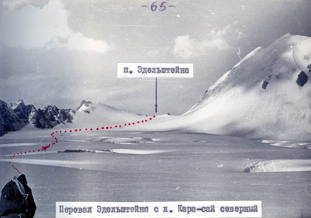 Путь от ночевки под пер. Эдельштейна на север, огибая боковой хребтик. Ледник закрытый, движение в связках. Выходить следует, как можно раньше, с первыми лучами солнца, по хорошо держащему насту. Иначе уже с 9-10 часов утра придется тропить, проваливаясь довольно глубоко, почти по пояс. После того, как боковой хребтик обогнут, следует двигаться на восток с небольшим подъёмом, на предперевальную террасу. Здесь есть небольшие озера, покрытые тонким слоем льда. С этой террасы открывается вид на перевал - довольно крутой снежно-ледовый склон (40-45°). Справа и слева от склона выхода скал (фото 23-24).