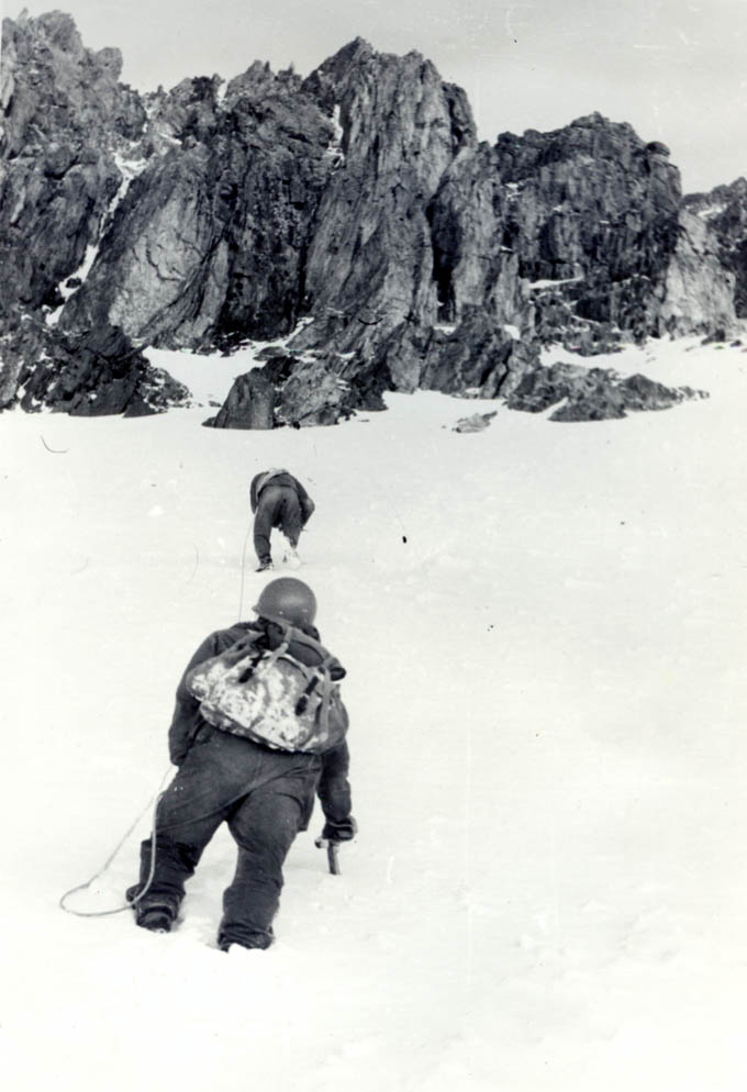 Подъем до бергшрунда не представляет сложности - склон на этом участке заснежен. Выше бергшрунда слой снега быстро истощается, нужно идти в кошках. Около "острова" появляется натечный лед. Выше "острова" необходима перильная страховка, первому рекомендуется работать без рюкзака. Первая веревка - от "острова" до скал гребня /крутизна 40-45°/, вторая веревка, наиболее крутая, /крутизна 45-50°/ пересекает кулуар, открывающийся слева, третья /крутизна 45°/ снова приводит к скалам. Эти три веревки - наиболее трудная часть подъема, здесь рекомендуется использовать ледовые крючья.