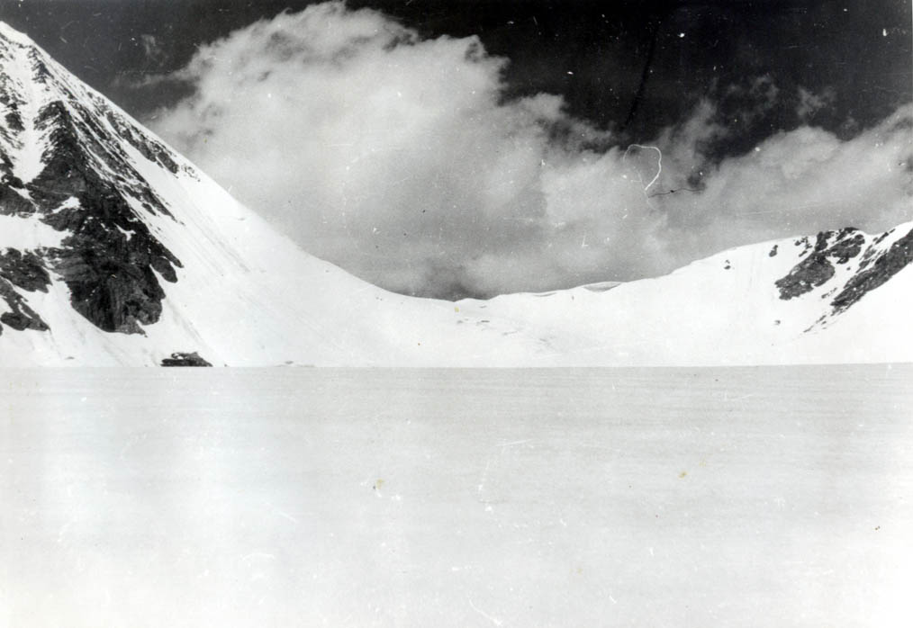 Дальнейший путь проще - ледник у скал оттаял, образуя подобие рантклюфта, по которому можно двигаться, используя для страховки скальные выступы. В заключительной части склона /последняя веревка/ "рантклюфт" сходит "на нет", появляется натечный лед. Здесь необходимы ступени. Крутизна всего участка подъема вдоль скал 40-45°, длина - три веревки. Преодоление основного взлета занимает 5-6 часов, нужно навесить 5-6 веревок.