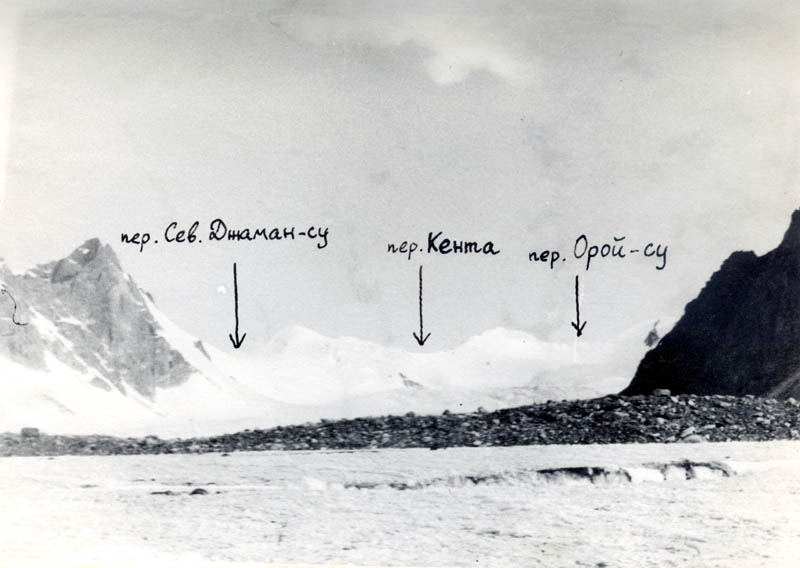До похода о леднике Орой-су нам было известно мало. Имелись общие сведения из каталога ледников /см. список литературы/: длина - 5км, ширина - 0,5км, высота языка - 3860м, высота снеговой линии - 4300-4850м, крутизна - 12°-14°. Имелись снимки ледника с южных склонов Терскей-Алатау и с ледника Восточный Орой-су /отчеты Харченко и Головкина/. На снимках хорошо видны перевал Тренировочный и седловина, ведущая на ледник Солнечный. Главной задачей похода было исследование туристских возможностей ледника Орой-су, в первую очередь прохождение перевала, ведущего на юг, на ледник Джаман-су.