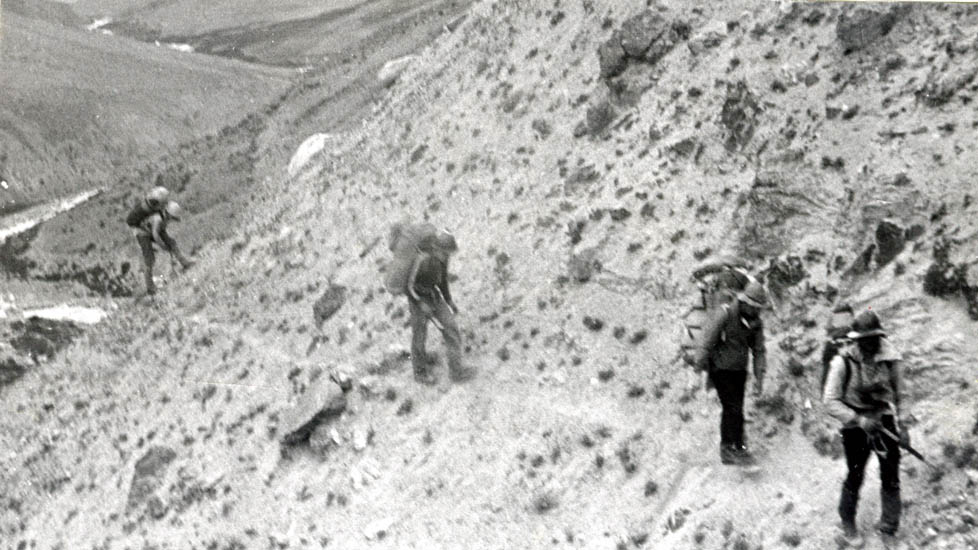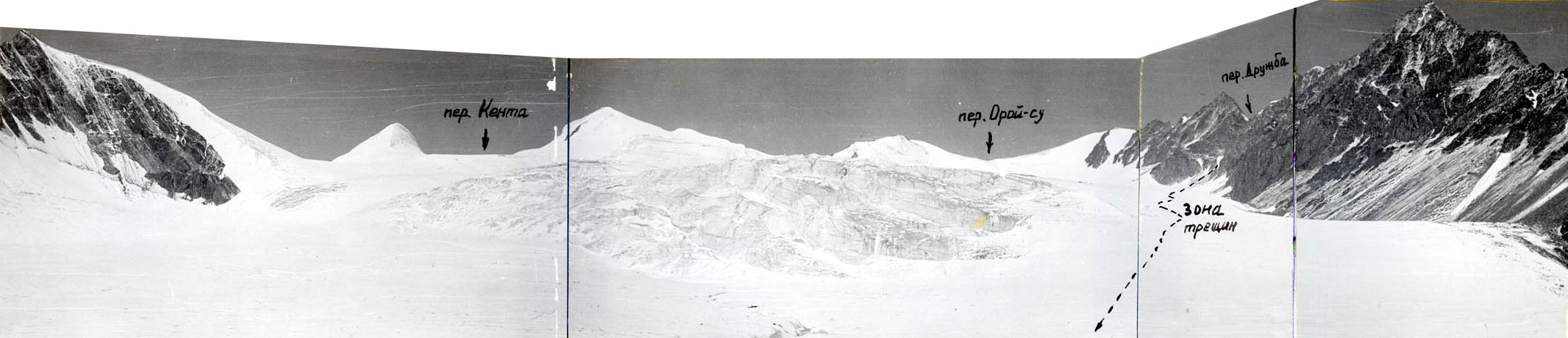 Спуск с перевала представляет собой короткий снежный склон крутизной 20°-30°, затем путь проходит среди мульд. Много широких закрытых трещин, которые очень трудно прозондировать. Идем с большой осторожностью. Постепенно ледник открывается и мы быстро спускаемся на срединную морену, разделяющую ветви ледника.