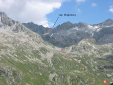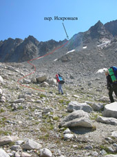![]() Начало спуска с пер. Искровцев. 1 - пер. Дырявый, 2 - пер. Зап. Уллу-Кель. |