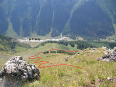 ![]() Выход из долины р. Трехозерная на дорогу. |
