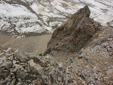 3 августа подъем дежурных в 5:30, общий в 6:00. Выходим в 7:30. В кошках подходим к осыпному выносу под скалами, здесь кошки снимаем, одеваем обвязки, достаем скальное снаряжение. При разведке перевала вчера мы решили подниматься по кулуару в левой по ходу части перевала. Здесь над склоном не висят карнизы, просматриваются скальные полки и выходы скал, на которых можно сделать промежуточные точки страховки(фото 103). В 8:11 группой из 4 человек поднимаемся по осыпи к скалам, осыпь крайне камнеопасна, подниматься неудобно. В 8:26 собираемся под скальным кулуаром, по которому будем подниматься на перевал, организуем точку страховки из петли на небольшом скальном выходе под склоном. Место для страховки не очень удачное, может простреливаться камнями из-под ног поднимающегося. Другие места для страховки выглядят не лучше, камни до них также могут долетать, но скалы разрушены сильнее, и точки будут совсем ненадежными.