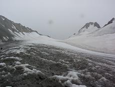 В 14:15 уходим с перевала. На спуск идет пологий ледник, сначала закрытый, потом открытый. Слой снега на закрытой части небольшой, на леднике есть трещины, но они хорошо читаются (фото 110). Идем в связках, придерживаясь правого борта ледника, здесь трещин меньше. Погода портится все сильнее, дождь то усиливается, то затихает, но видимость хорошая. В 14:45 подходим к перегибу ледника, высота 4420 (фото 111). Слева на леднике виден ледопад, путь справа не просматривается. Делаем здесь привал, руководитель идет на разведку, возвращается через 10 минут. Справа по ходу от ледника начинается осыпной склон, кажется, что по нему можно спуститься вниз. Спуск также возможен по леднику вдоль осыпи, но здесь придется вешать минимум две веревки на льду.