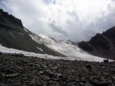 Место стоянки - тонкий осыпной чехол на бугре ледника, выравниваем на нем площадки. Высота 4280. Воду берем из ручья, текущего по леднику. Весь вечер в разных частях цирка слышны сильные камнепады, но до нашего места стоянки камни долететь не могут.