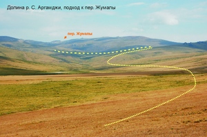 | По левому борту долины верховьев С. Аргамджи под перевал Жумалы | 40 мин. |