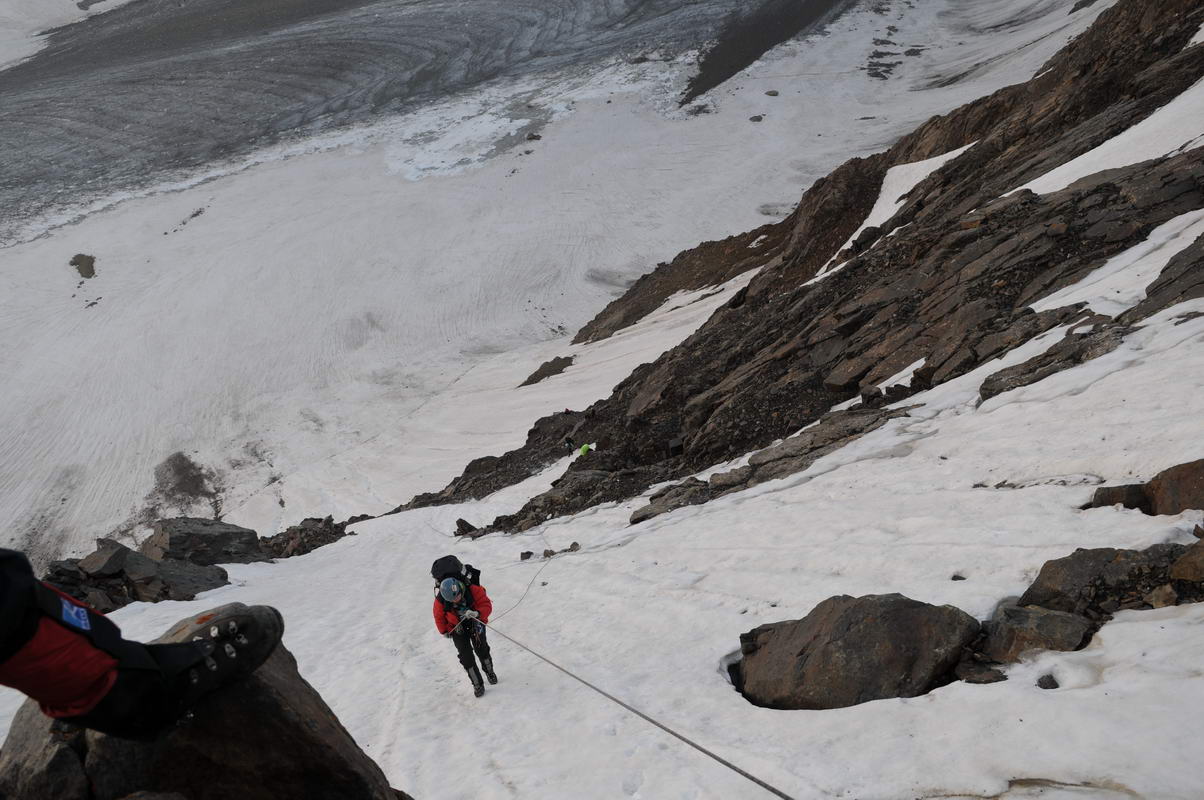 15 августа подъем дежурных в 4:30. С утра теряем много времени на сборы, наконец в 6:50 первый участник выходит провешивать веревки. Чуть правее места выхода на седловину есть пологая осыпная полка, по которой можно спуститься пешком. Лидеру делаем страховку, для остальных вешаем накопитель из двойной веревки(фото 192)(фото 193). Последний снимает накопитель с нижней страховкой. Дюльферять начинаем с хорошего монолитного выступа метрах в 20 ниже седловины. Первая веревка идет по фирну крутизной 45-50 градусов, в конце уходим чуть правее, чтобы сделать точку на скалах(фото 195). Вторая веревка также идет по фирну, выходя на замусоренные скалы на последних 10-15 метрах. Далее склон выполаживается до 25-30 градусов. Забираем правее, по осыпным полкам без страховки подходим к более крутому скальному поясу(фото 197). Вешаем еще одну веревку на скальном выступе, спускаемся по ней до снежно-ледового склона в нижней части перевала. Крутизна скал на этом участке достигает 60-70 градусов, но очевидно, что при подъеме на перевал с этой стороны можно найти более простой путь прохождения. Скальные веревки сдергиваем кевларом.