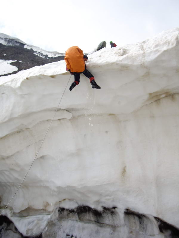 14 августа подъем дежурных в 6:30, общий в 7:00. Ночью был сильный ветер, даже пришлось вылезать и получше растягивать одну из палаток. Спуск по перилам начинаем в 8:20(фото 174). Первые 2,5 веревки идут по сильно разрушенным скалам, местами покрытым слоем мелкой осыпи, крутизна около 50 градусов (фото 175). Станции делаем на скальных выходах, одну из них подстраховываем скальным крюком (фото 176). Веревки сдергиваем кевларом, вторая сдергивается с трудом и сбивает несколько камней. Кроме этого, с перевала практически не сыпет. Третья веревка также висит на скальном выходе, но примерно посередине выходит на снежно-ледовый склон в нижней части перевала (фото 177). Крутизна склона здесь падает до 35-40 градусов, слой снега большой. Вешаем по склону еще 2 веревки на ледорубах, точки получаются очень надежными. Эти веревки снимаем с нижней страховкой. Оканчивается склон бергом высотой около 7 метров(фото 178)(фото 179)(фото 180). Долго пытаемся на последней точке над бергом докопаться до льда, чтобы была возможность сдернуть последнюю веревку через бур-самосброс, но, даже углубившись на метр, до льда не доходим. Последний участник делает ледорубный крест и спускается, после чего, приложив немалые усилия, сдергиваем крест кевларом. Всей группой под бергом собираемся в 12:25, высота около 4000 метров(фото 181).