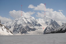 ![]() Вид вперед от начала основной зоны трещин (1 - пик Белый, 2 - пик Ахун, 3 - ледник Ахун) |