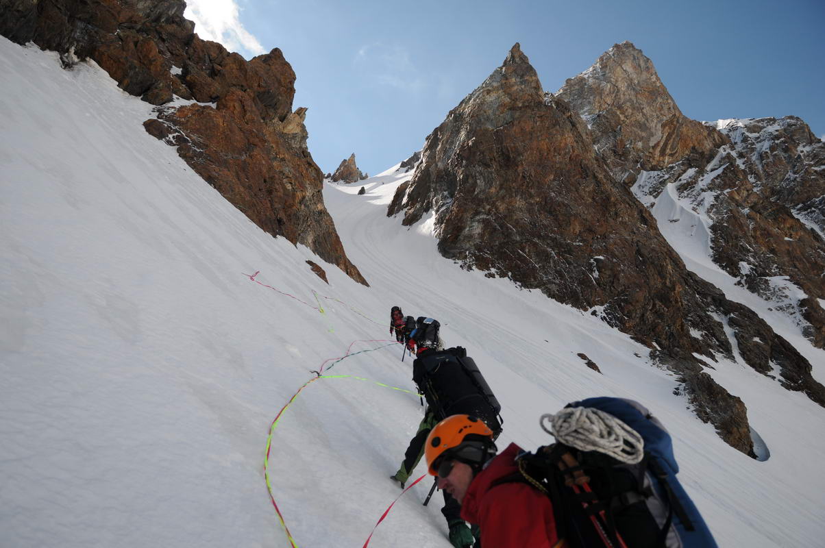 Необходимое снаряжение: основная веревка 50 м * 3, каски, ледорубы, кошки, ледобуры, петли, лавинные ленты.