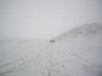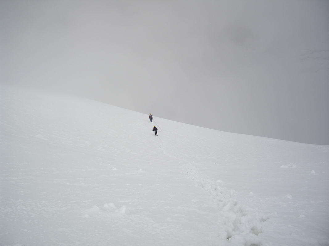Далее по отчету первопроходцев имеет смысл спускаться прямо вниз, не увлекаясь уходящими вбок пологими полками, но этот путь по фотографии прошлого года и просмотренному сверху рельефу не выглядит оптимальным. К тому же, прямо у окончания площадки просматривается огромная трещина, переходить через которую не хочется. Поэтому формируем связки-двойки, первую связку с рацией заранее высылаем вперед на разведку по пологой снежной полке, спускающейся влево по ходу (фото 110). К сожалению, в это время на склон садится облако, видимость падает до 20-30 метров. Дожидаться хорошей погоды на площадке нет никакого желания, мы отошли от следов небольших обвалов с пика Щуровского Главный на безопасное расстояние, но огромные ледовые сколы, висящие на склонах пика, оптимизма не вызывают. Идем в локальные окна, периодически садимся на привал и пережидаем очередное молоко. Пологая полка влево продолжается достаточно долго и позволяет нам несколько сбросить высоту, но затем склон становится круче, а слой снега на нем меньше. Некоторое время пытаемся спускаться короткими траверсами, подлавливая локальные более пологие полки и делая страховку через промежуточные буры. Пройдя так порядка 150 метров понимаем, что получается неэффективно. В открывшееся на короткое время окно успеваем просмотреть спуск по ледовому склону, решаем вешать вниз веревки.