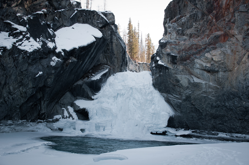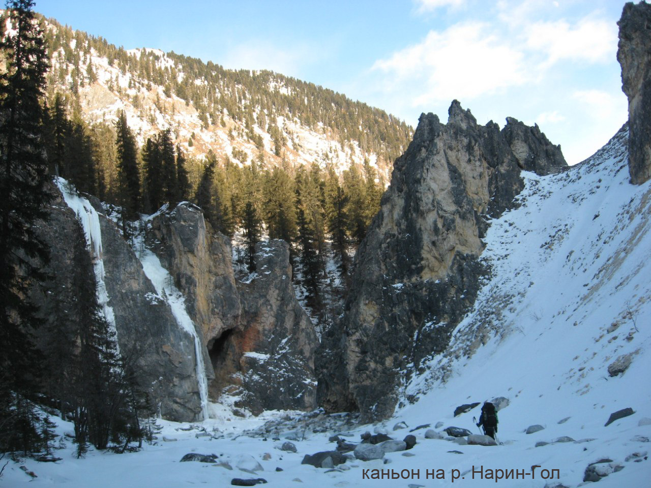 Это день мокрых наледей и красивых каньонов. Хорошее место для стоянки или обеда: N51,57.958,E101,37.475. Мы здесь обедаем. Доходим до слияния с Ара-Ошеем. Через километр вход в каньон. Доходим до незамерзающего водопада.