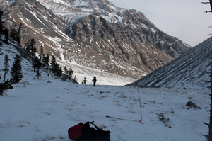 Проходим водопад и вскоре встаем на ночевку выше границе леса. Строим небольшую стенку из снежных кирпичей. Погода пока хорошая.