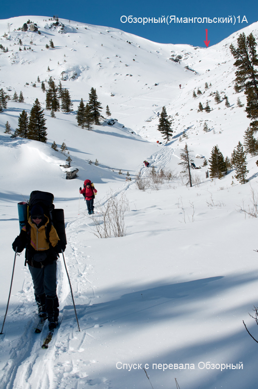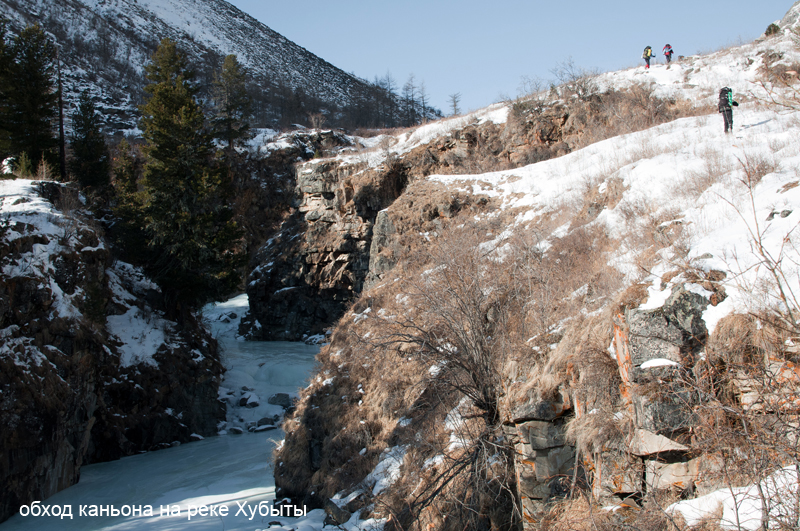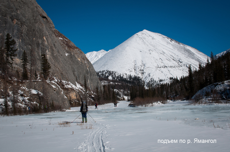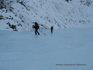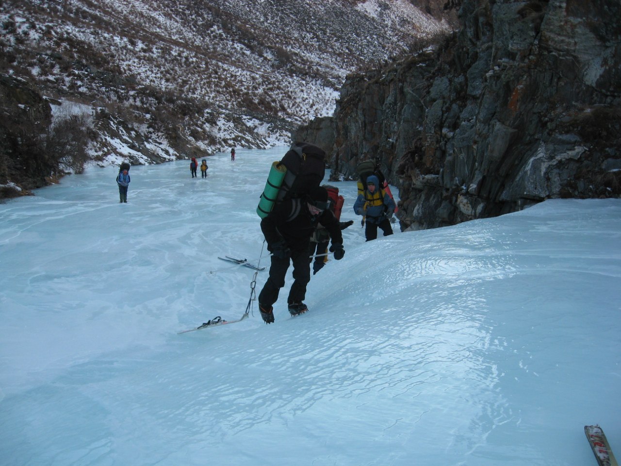 Тропа поднимается довольно высоко и спускается довольно круто к Яманголу. Далее поднимаемся по Яманголу на лыжах, затем надеваем кошки на крутых наледях.