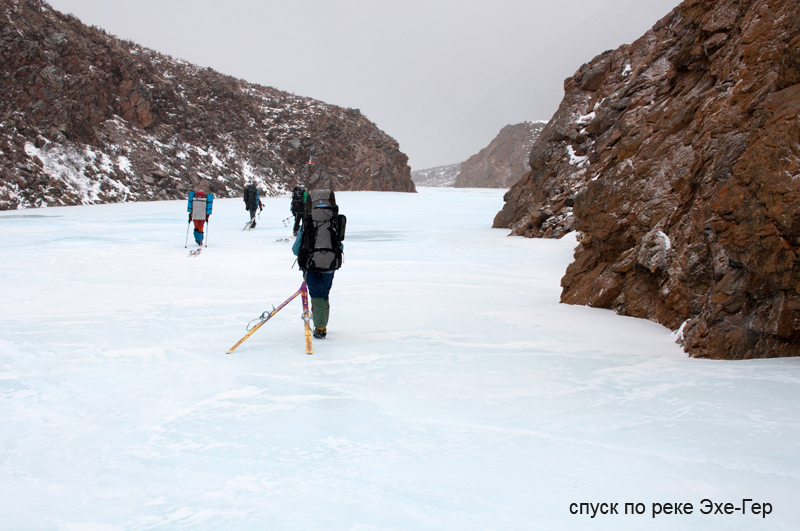 С утра сильный ветер. Дежурные боролись с летающей по палатке печкой. Перевал едва видно. Пока собирались и подходили под перевал, видимость улучшилась. В лоб перевала не стали подниматься, хотя там были следы чьи то. Облезли справа по камням. Спустились, встретили троих Иркутян, пообедали. После обеда спускаемся по Эхе -Геру. Встали на ночевку недоходя водопада на левом(по ходу) берегу реки. Дров полно здесь. И телефон ловит, МТС. Погода совсем испортилась. Метель метет. Снег падает крупными хлопьями. Первый раз за поход такое.