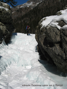 Спускаемся по вниз по Китою. Китой очень разнообразен, наледи, выходы теплых источников, Каньон Лизкины щеки ( перед впадением с Ара - Ошеем) очень красивый. Перед каньоном обедаем, догоняют Бауманцы. Рассказали про каньон Ямангола, что он обходится по тропе.
