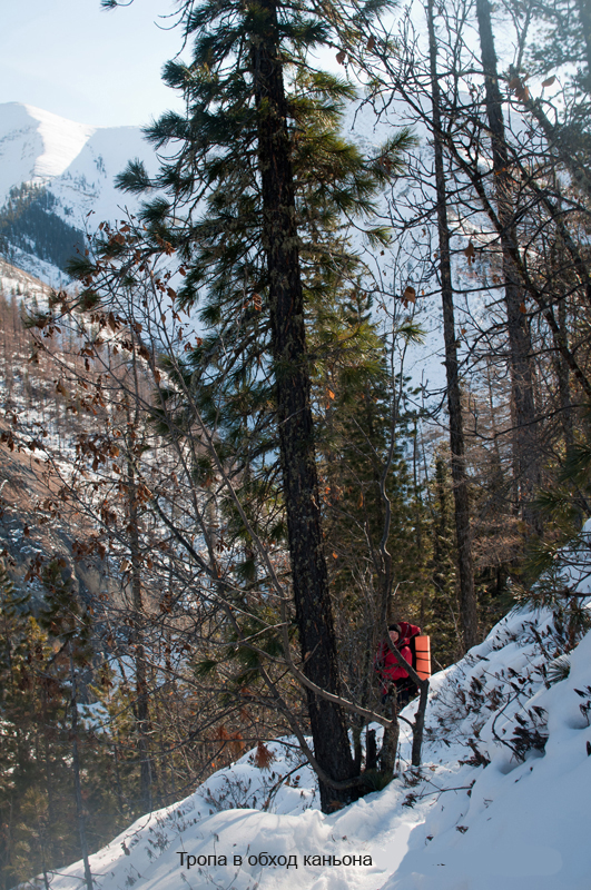 Поднимаемся на тропу слева (по ходу). Можно на тропу сворачивать сразу не входя в каньон, а то пришлось вылезать с элементами свободного лазания. Ничего сложного, но с лыжами и тяжелым рюкзаком не очень удобно. Обойдя каньон, встаем на ночевку.