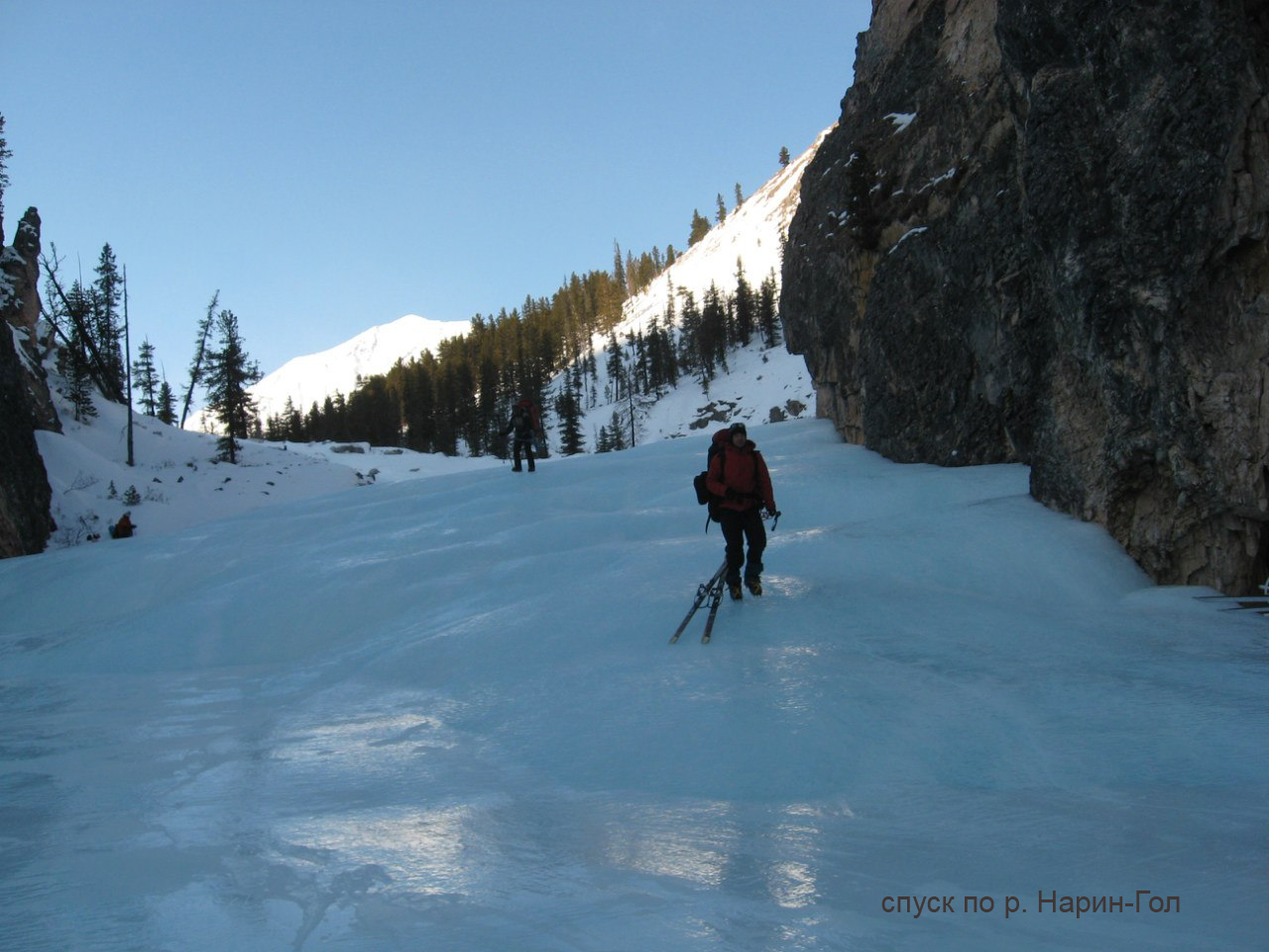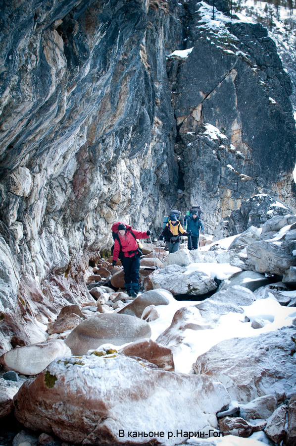 10,4 | 12,4 | Каньон Нарингол завален камнями, - мало снега. передвигаемся медленно. решаем вставать на ночевку не доходя Шумака | р. Нарин-Гол - р. Шумак - шумакские источники(избушка) |