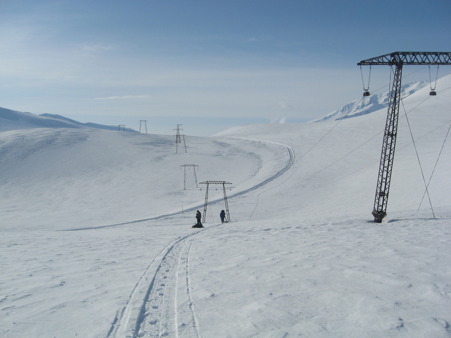 С утра за 1 ходку доходим до перевала, проходим домики. Спрашиваем не поедет ли кто вниз. Нам ответили что поедут только через неделю. И мы потропили вниз, ибо дорогу засыпало. Тут нам на радость, проехала вахтовка навстречу, проделав нам путь. Спуск крутой, навязываем веревочки, Саша съезжает на камусах. Обедаем у первых деревьев. После обеда движемся по дороге. Около 18 часов проходим речку Поперечную и встаем напротив базы " Снежная Долина". Тут подъемник, бассейн и гостиница. Бассейн 300р, гостиница от 2тр. за человека сутки.