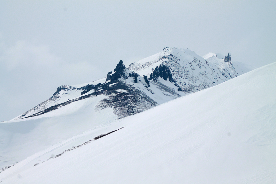 Сегодня выходим рано, около 8 часов. Подходим под вулкан Горелый, большую часть по дороге. Погода отличная. Перекусываем. Начинаем восхождение. Время от стоянки до кратера - около 2 часов. Камуса рекомендуются. Крутых участков нет. Поднимаемся к краю кратера, тут оставляем лыжи. Обходим кратер справа по гребню. Попадаются крутые участки с фирном и льдом. Без кошек нам было несколько неуютно (у нас 1 на группу). Но поскольку личная техника у всех хорошая, прошли без приключений. Погода портится, небо заволакивает. Спускаемся в молоке. Спуск занимает около полутора часов. встаем на месте прежней стоянки (16 апреля).