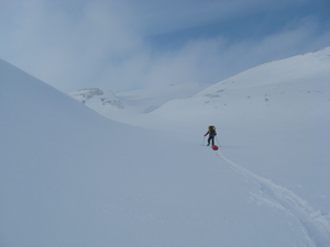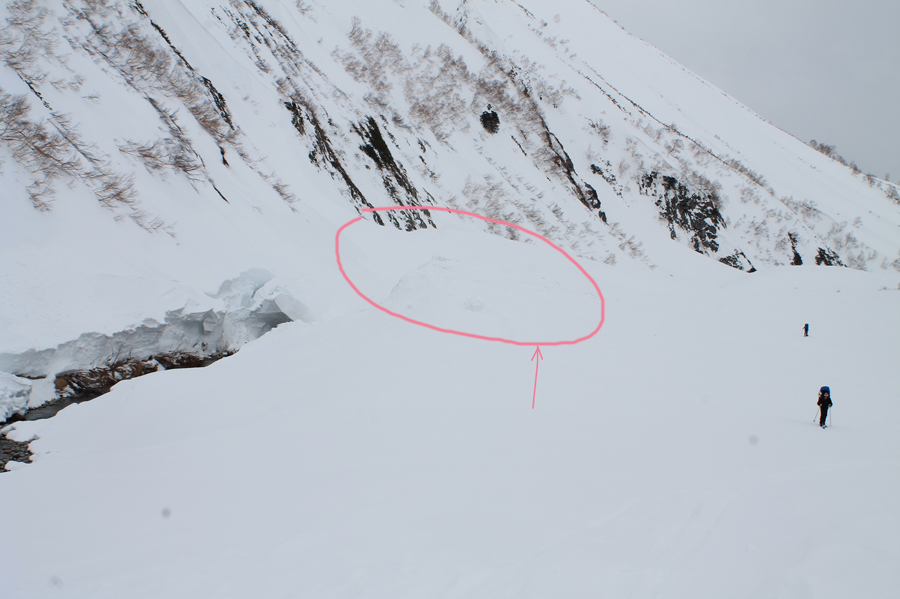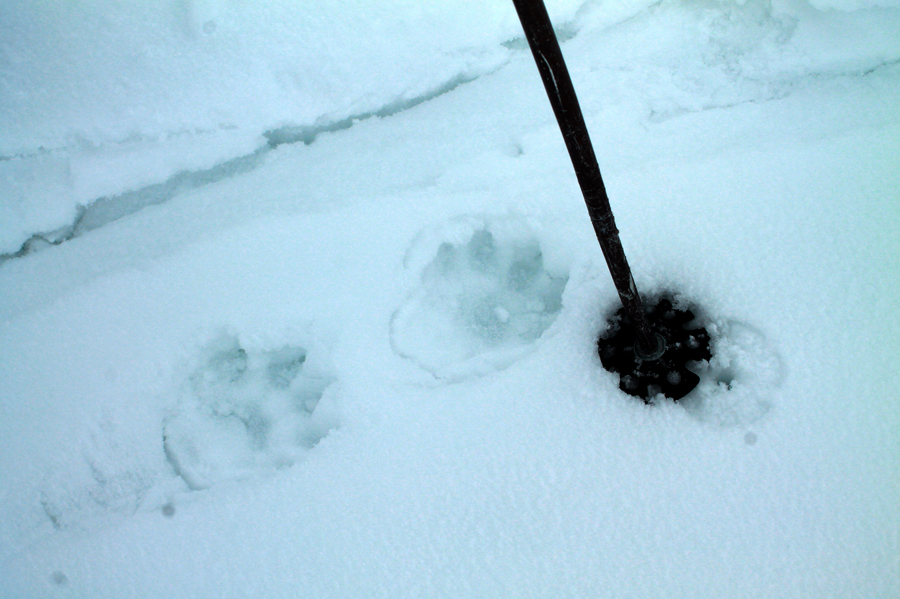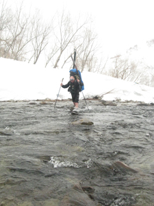 После источников снегоходный след то пропадает, то появляется местами. Доходим до прижима, поднимаемся вверх по крутому берегу(Может быть сразу следовало идти по верху). Пройдя немного по верху обрыва доходим до следующего прижима. Тут очевидно приходится бродить. Переходим на левую сторону реки( по ходу), продолжаем движение вверх по долине. Справа огромный старый (мы определили около месяца) лавинный вынос. Далее река закрыта, но попадаются открытые ручьи. На склоне видим убегающую росомаху. У последних деревьев встаем на ночевку около 6 часов вечера. Возможно было бы удобнее делать ночевку чуть раньше, в хорошем участке березового леса.