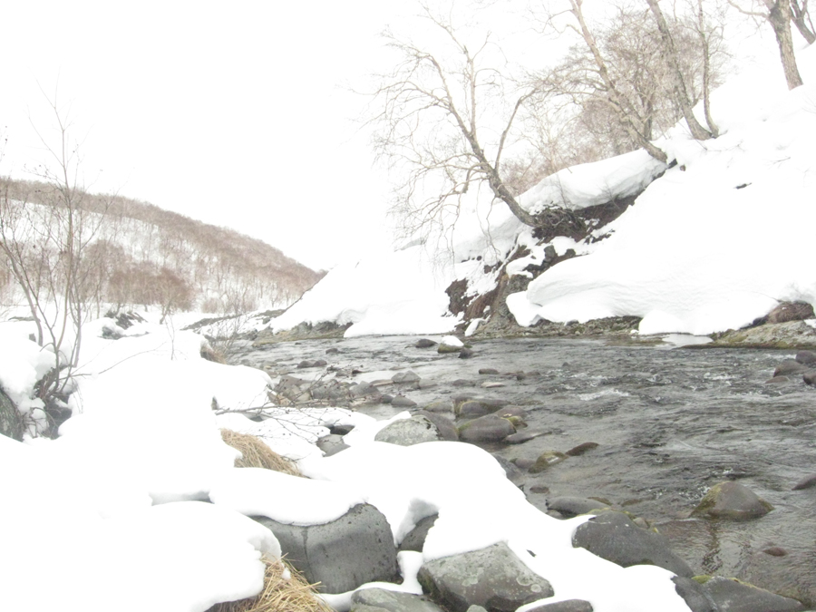 Вышли около 9, идем по буранному следу вверх по р. Карымшине, по правому берегу (по ходу). Температура около 0, лыжи подлипают даже пластиковые. Передвигаемся медленно, доходим до Карымшинских источников, решаем устроить тут обед.
