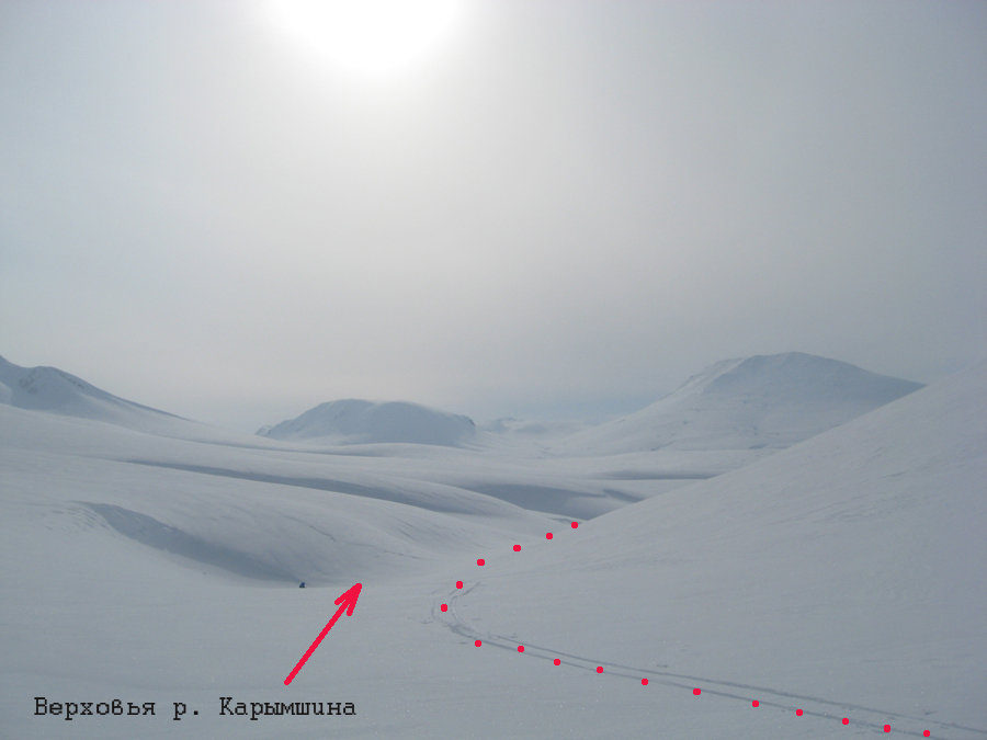 | 11.04.2013 | м/н р. Карымшина - Карымшинские горячие источники - верховья р. Карымшина(зона леса) | +205 | 10 | 12 | по снегоходному следу до источников, брод реки, ночевка в последних кустах | м/н - верховья р. Карымшина (отм. 283м) |