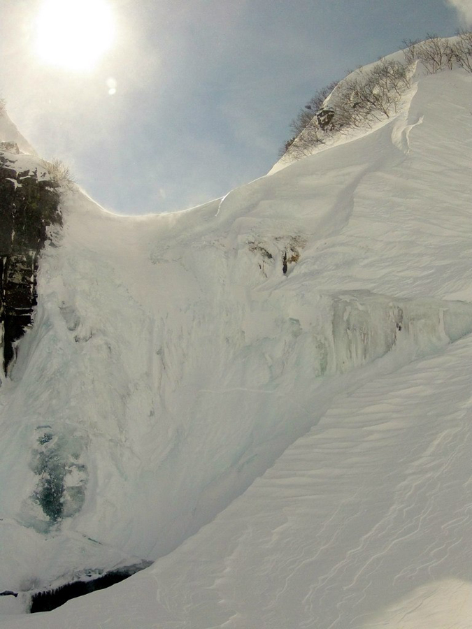 Утром дует немного, но видимость хорошая. Выдвигаемся вверх по долине около 9 утра. Движемся по дну узкой долины, вначале небольшие участки открытого ручья. Ступени некрутые, снег задутый наст, тропежки практически никакой. Доходим до водопада. Он оказывается непроходимым. Высота как и на карте около 14 м, под ним промоина, бурлит вода. Обходим его справа по крутому склону. Рекомендуем обход слева (по ходу), тут придется меньше набирать высоту. Видимость ухудшается. Доходим до высоты 691м около 15 часов. Решаем тут остаться на ночевку, т.к. стало почти совсем ничего не видно, белая мгла. Место ровное, склоны вокруг пологие, есть надувы где можно вырыть пещеру, взять кирпичи для стенки.
