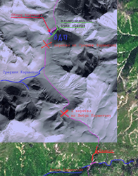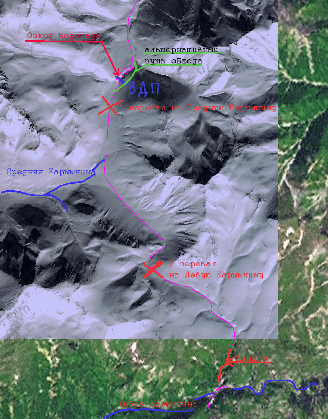 | 13.04.2013 | м/н - отм. 691м | +486 | 5,5 | 6,6 | подъем, обход водопада, погода ухудшилась, ночуем перед первым перевалом(отметка высоты 691м) | м/н - пер. 1А? между ср. Карымчин и лев.Кар.(880м) - перевал - р. Левая Карымчина |