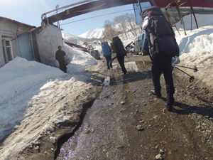 В марте- апреле могут быть мокрый снег и дождь. Рекомендуется брать палатку с тентом. Мы ходили с горной 4-местной палаткой с 4 дугами. Готовили на бензиновых горелках в палатке 3 раза в день. На обед почти всегда ставили палатку и там готовили. Лыжи лучше всего брать платиковые. Деревянные лыжи практически все время подлипали. Двое ходили на пластиковых лыжах типа бек-кантри с креплениями NNN- bk и ботинками под них. 1 лыжи были пластиковые с креплениями 3 пин и ботинками под них. И 1 лыжи деревянные бескид с креплениями ски тур и пластиковыми ботинками. Поскольку сильных морозов не было все варианты более менее удобные. бескид в конце похода все таки сломали.