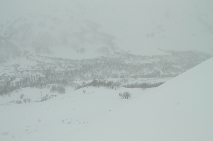 По плану - восхождение на Горелый, но сильный ветер, метель, видимость 0.