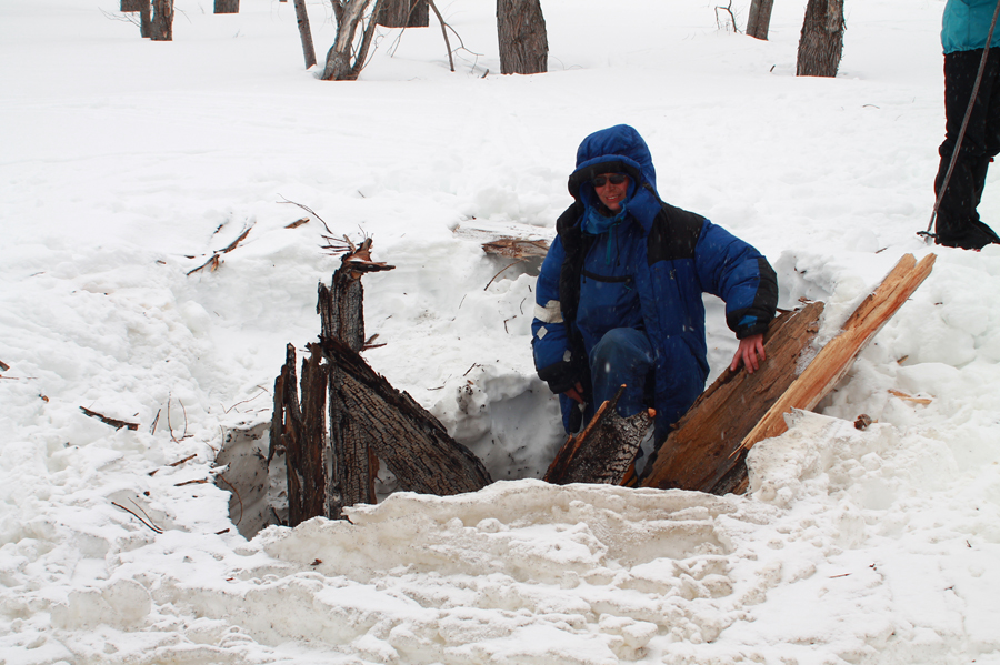 | 10.04.2013 | местный автобус от г. Елизово до п. Термальный, далее на лыжах до р. Карымшина | +40 | 15 | 18 | от Термального начинается зимник, однако проехать можно было дальше, но мы пошли пешком/на лыжах | машина до верховьев р. Паратунка, мост через р. Карымшина |