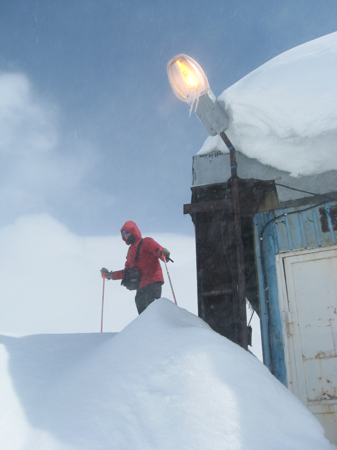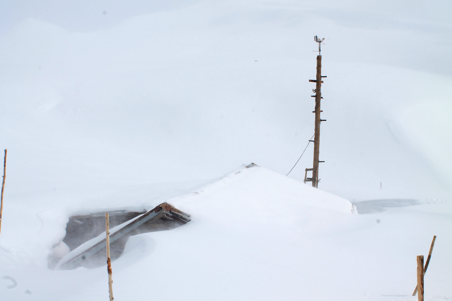Погода такая же, но сидеть уже надоело и выбираем окно и перебираемся под Мутновский вулкан в надежде взойти хоть на него. Ходовое время около 3 часов. Погода совсем ухудшилась, решаем рыть пещеру. Боимся, что палатку мы просто не поставим или ее разорвет ветром. Где на карте отмечене метеостанция - видим скелетик дома. Потом местные утверждали что там был и хороший домик. Но мы так этого и не узнали. Пытались пройти посмотреть, но началась мокрая пурга, прошли 50 метров и были уже все мокрые.