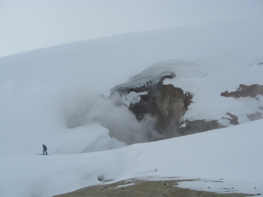 Утром пещера начала капать. Погода немного улучшилась. Около 11 дожидаемся "окна" и решаем идти к ГЕОТЭС. Движемся почти по тому же пути, что шли сюда, затем сворачиваем на перевал (н/к, 1060м) и при сплошном молоке спускаемся с Мутновской ТЭС. В гостинице остановится дорого, нам предлагают откопать один из номеров в стороне от гостиницы. Откопали 1 этаж вниз, а там лепота: тепло от станции, свет, горячая вода.