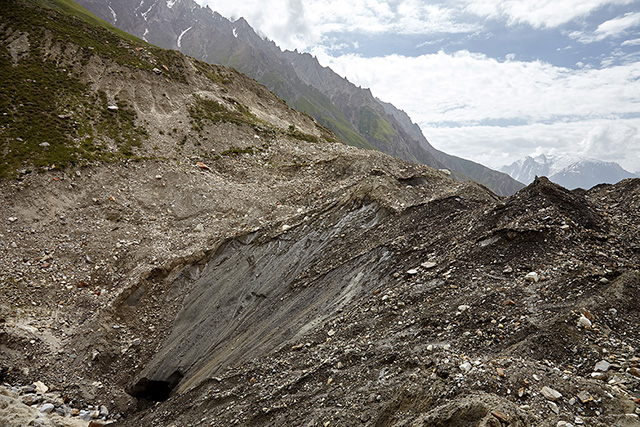 В 12:00 выходим к кошу Taga Phari (тоже без людей). Вниз по долине пути нет – карман морены заканчивается, и склоны долины уходят прямо в реку, вытекающую из ледника. Где-то здесь тропа должна выйти из кармана, пересечь ледники Barpu и Bualtar у их слияния и выйти в посёлок Hoper. Ледник находится ниже нас на несколько десятков метров под конгломератным обрывом. Почему-то много ложных (старых?) троп, упирающихся в обрыв.