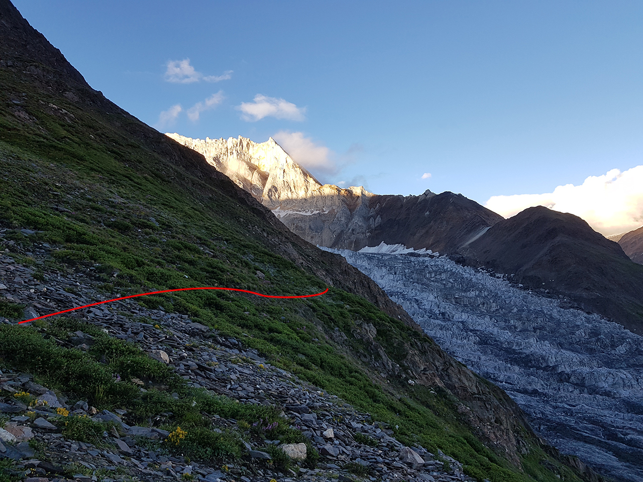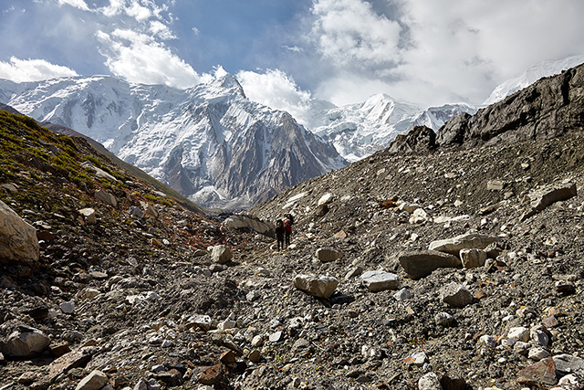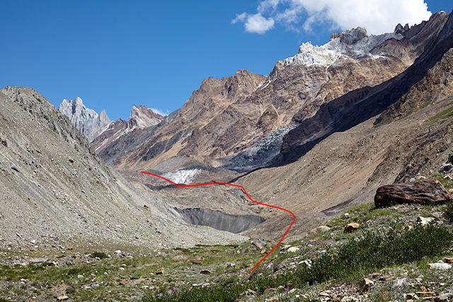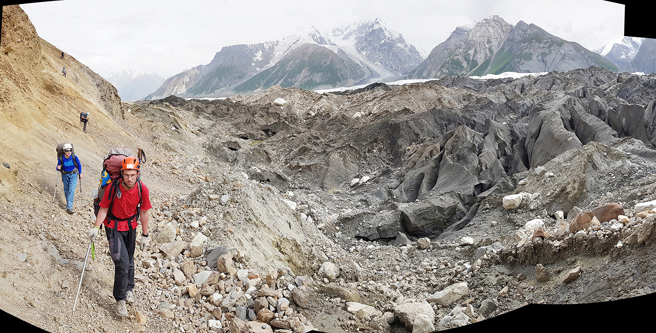 Левый борт ледника Bualtar – конгломератный обрыв высотой 120 метров. В нижней части тропа достаточно узкая. Важно точно на нее выйти, так как подъем без тропы невозможен. К счастью, заход на тропу достаточно хорошо видно с ледника.