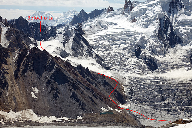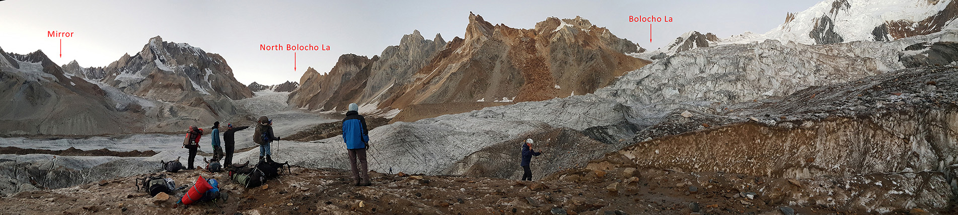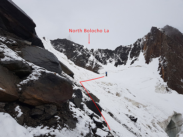 По перевалу Bolocho удалось найти описание его первого прохождения в 1903 году в книге "Ice-bound Heights of the Mustagh", написанной первопроходцами Fanny Bullock Workman и William Hunter Workman. Также стоит обратить внимание на другую книгу тех же авторов "The Call of the Snowy Hispar" Приведем ниже отличную цитату из первой книги, которая вполне может использоваться в качестве эпиграфа многими экспедициями: