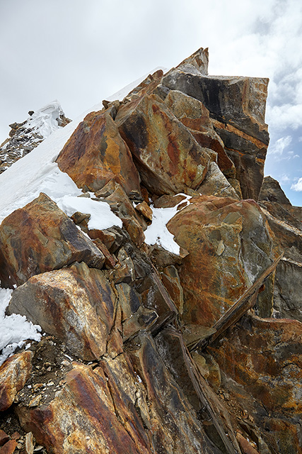 На основе опыта 2014 года мы брали самодельные снегоступы на кошки конструкции Лебедева, но полноценно ими так и не воспользовались из-за относительно небольшого количества. Но другим группам мы всё равно советуем брать снегоступы, если заметные участки их походов будут проходить на высотах 5500 м и выше. На высотах в районе 5000 м снега немного и снегоступы не нужны. Снеговая линия в августе в районе нашего похода находилась в районе высоты 4600 м.