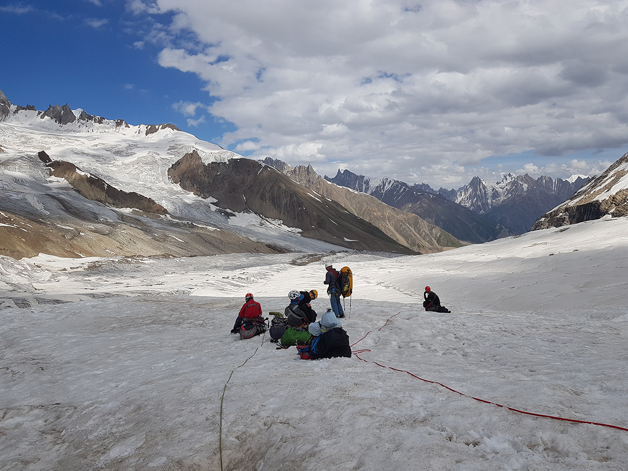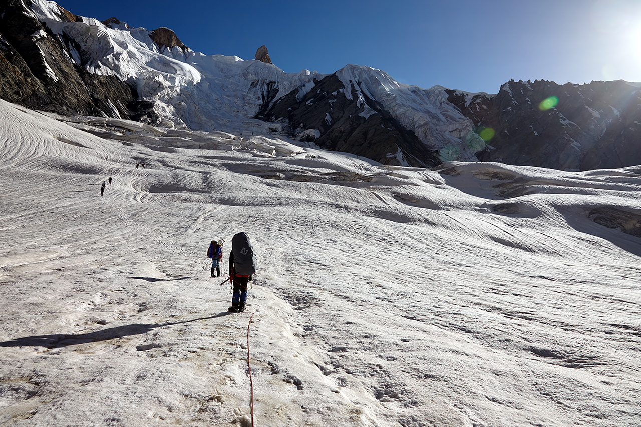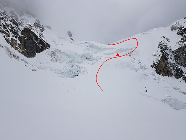 Восточный перевальный взлет проходился ранее несколько раз радиально во время успешных и неуспешных попыток восхождения на пик Malubiting. Основная линия движения – по центру 300-метрового крутого снежно-ледового склона. В верхней части оптимальная траектория определяется текущей конфигурацией ледовых разломах. В наших условиях мы сначала отклонялись к орографически левой стороне склона, а затем выходили на низшую точку седловины косым траверсом ниже верхнего бергшрунда. Всего было повешено 5 перильных веревок, остальную часть взлета мы поднялись в связках с одновременной страховкой.