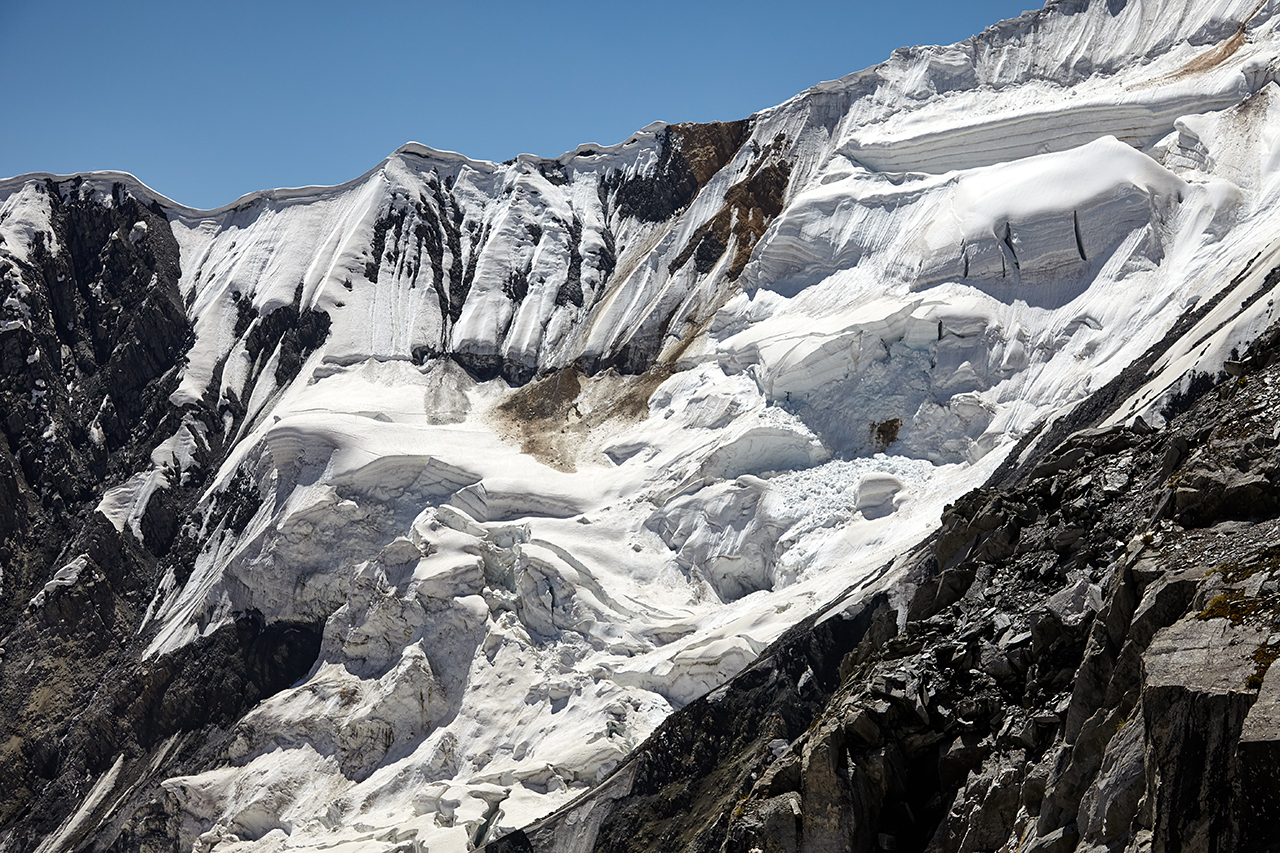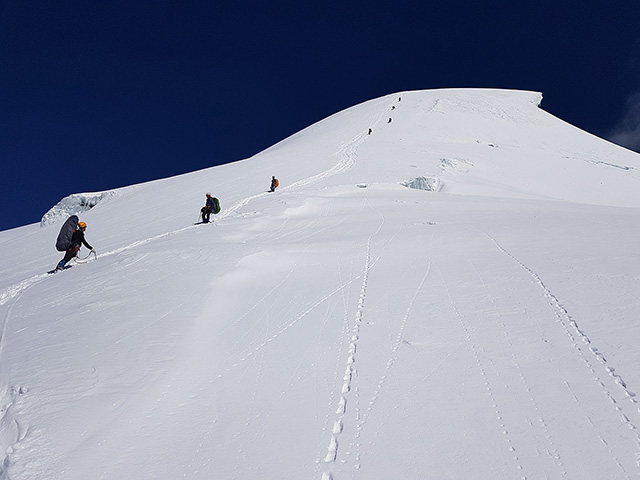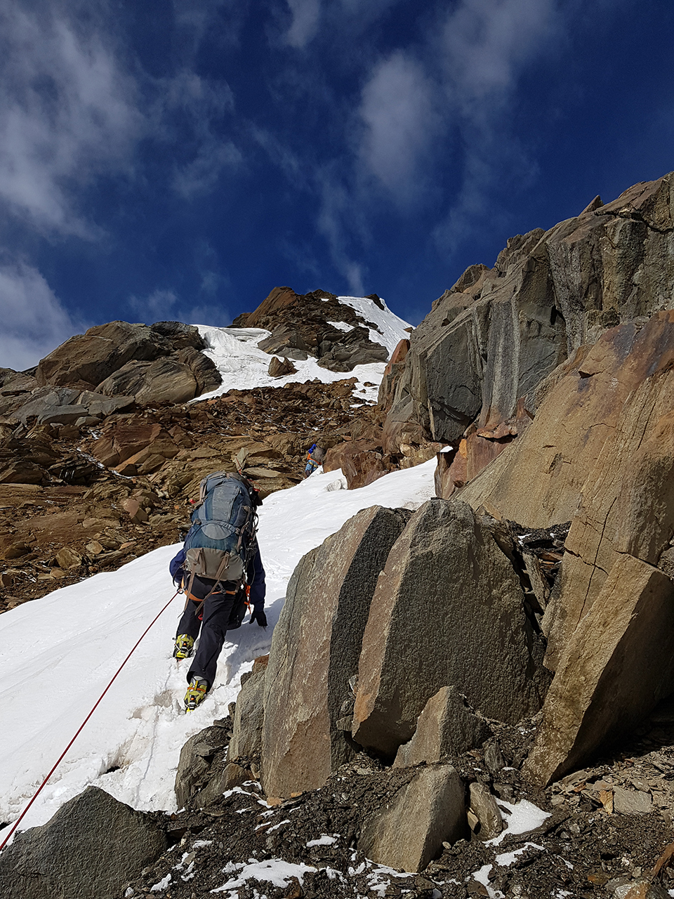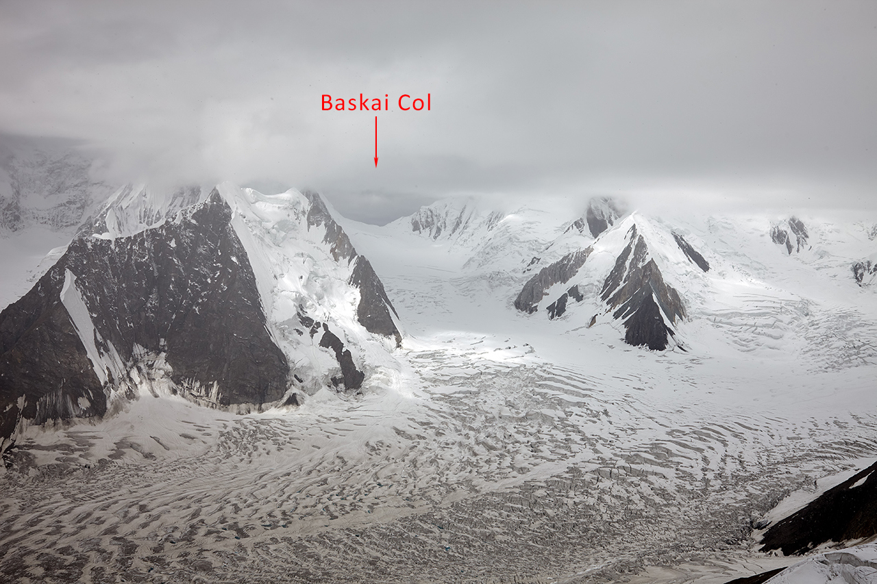 Восточный перевальный взлет проходился ранее несколько раз радиально во время успешных и неуспешных попыток восхождения на пик Malubiting. Основная линия движения – по центру 300-метрового крутого снежно-ледового склона. В верхней части оптимальная траектория определяется текущей конфигурацией ледовых разломах. В наших условиях мы сначала отклонялись к орографически левой стороне склона, а затем выходили на низшую точку седловины косым траверсом ниже верхнего бергшрунда. Всего было повешено 5 перильных веревок, остальную часть взлета мы поднялись в связках с одновременной страховкой.