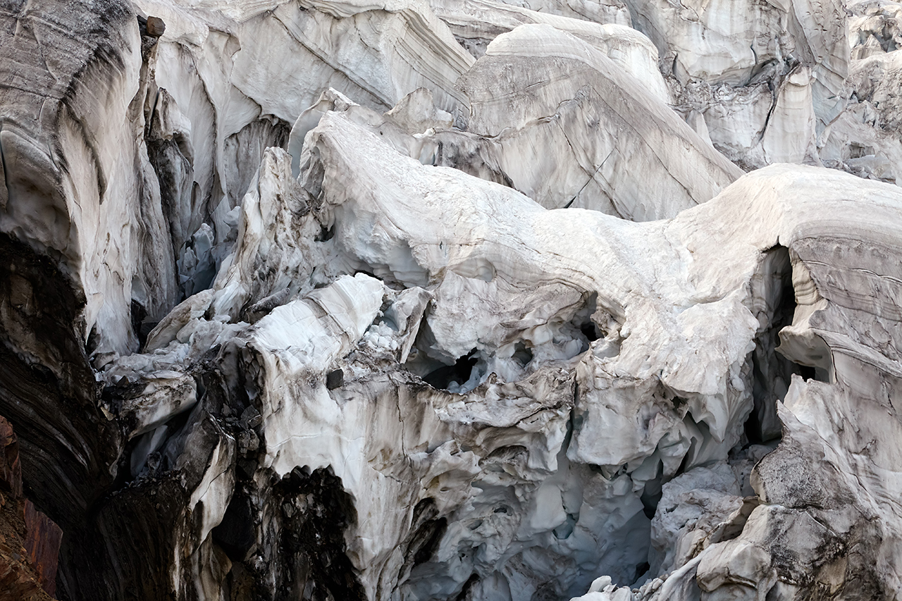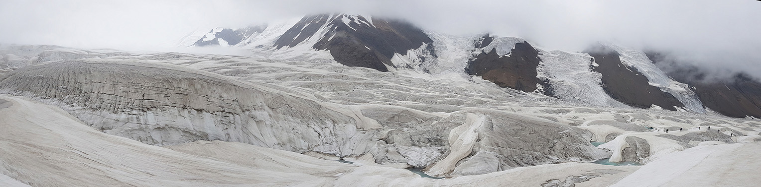 Начало пути леднику Bualtar несколько неочевидно: тропа теряется, ледник неровный, есть участки открытого льда, в одном месте даже приходится нарубить несколько ступеней ледорубом, чтобы не надевать кошки. Дальше он становится более ровным и полностью зачехлённым. По поверхности текут ручейки и нам наконец-то удается пополнить запасы воды.