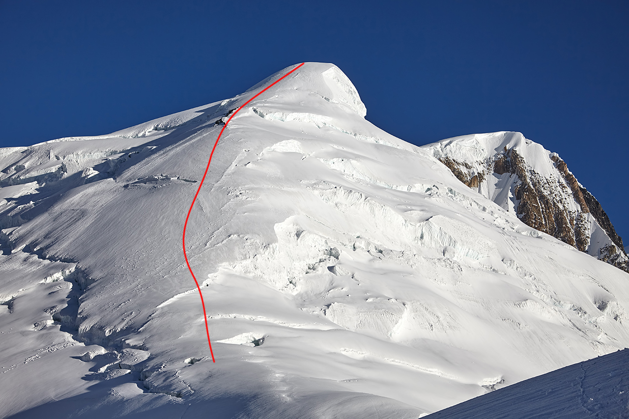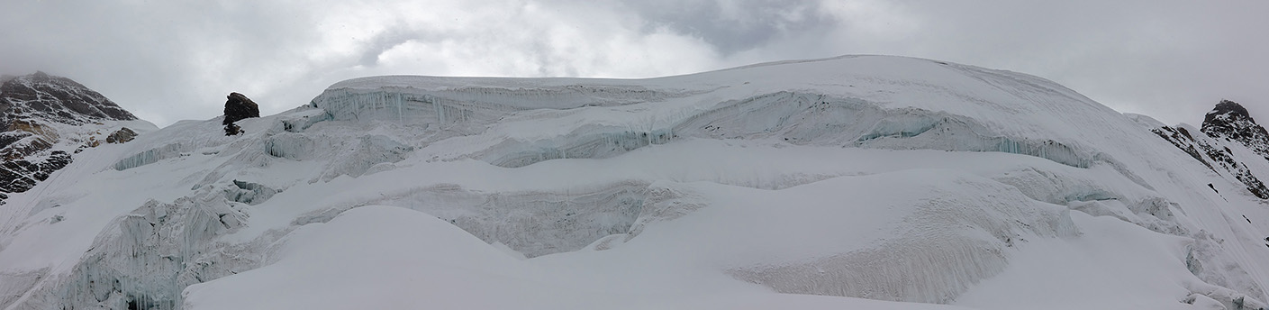 Можно также попробовать начать подъем на перевал с запада непосредственно под скально-ледовым участком. По сравнению с предыдущим вариантом это сократит пребывание в зоне потенциальных ледовых обвалов с сераков. Но в этом варианте могут быть проблемы с большим количеством снега на подходах и с преодолением бергшрунда.