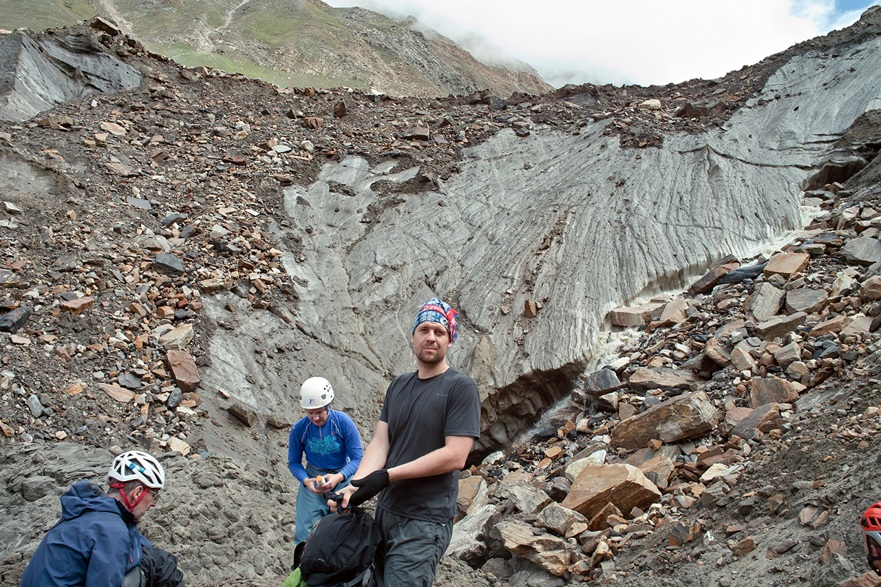 Для выхода в правильное место спуска на ледник надо после огромных камней справа от тропы выбирать на развилках левые тропы и выйти на гребень морены в точке с координатами (N36.222701°, E74.796822°, 2932м). В 12:55 спускаемся по тропе с правого борта на зачехлённый ледник Barpu. Он порос кустарником, встречаются небольшие мутноватые озёра. Питьевой воды опять нет, в озерах вода стоячая, вокруг следы скота.