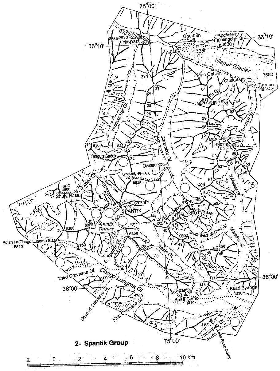 | Нитка маршрута: | пос. Arandu, 2705м - ледник Chogo Lungma - ледник Bolocho - перевал Bolocho La (2А, 4975) - ледник Kero Lungma - перевал North Bolocho La (2Б, 5105, п/п) - ледник Bolocho - перевал Зеркальный (2Б, 5290, п/п) - ледник Sgari Byen Gang - ледник Chogo Lungma - пик Spantik (3А, 7027, рад.) - ледник Chogo Lungma - перевал Polan La (3А, 5830м, сквозное п/п) - ледник Sumayar Bar - ледник Barpu - пос. Hoper, 2820м |